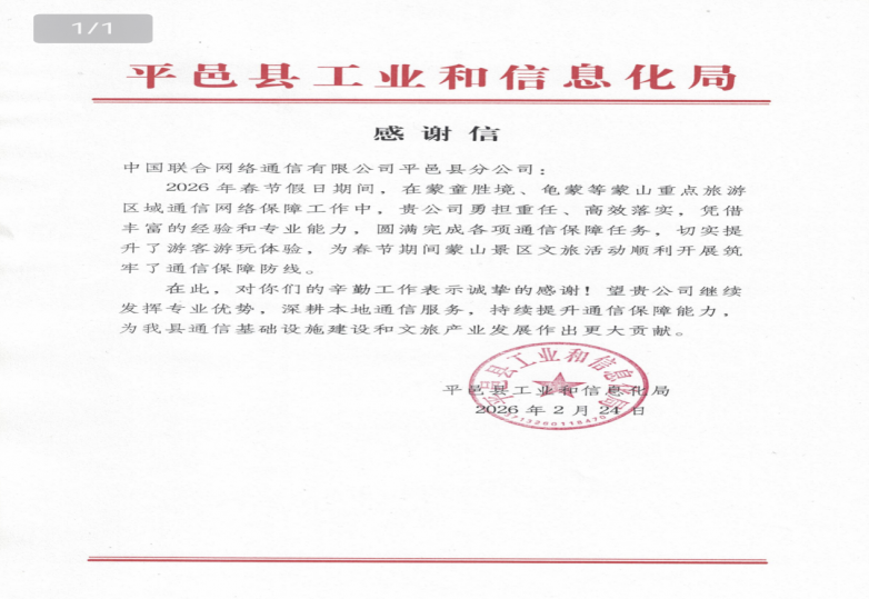2月24日,平邑县工信局发来表扬信,高度评价临沂联通“勇担责任、高效落实,提升了游客游玩体验”,称其“为春节期间蒙山景区文旅活动顺利开展筑牢了通信保障防线”。