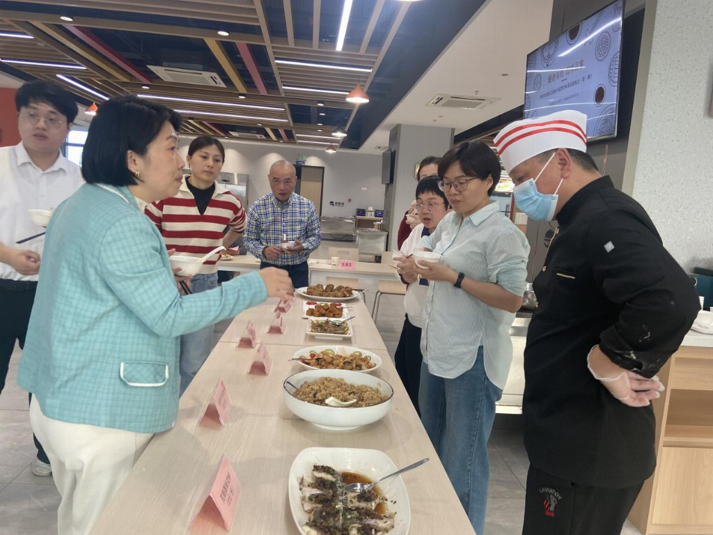 菜品介绍后,自由品鉴环节正式开启。一道道色泽诱人、香气扑鼻的晋味菜品整齐陈列。验收官们驻足品尝,从外观、口感、营养搭配、创意呈现等维度对菜品逐一考量,品鉴中交流感受、分享建议,现场洋溢着轻松愉悦的氛围。